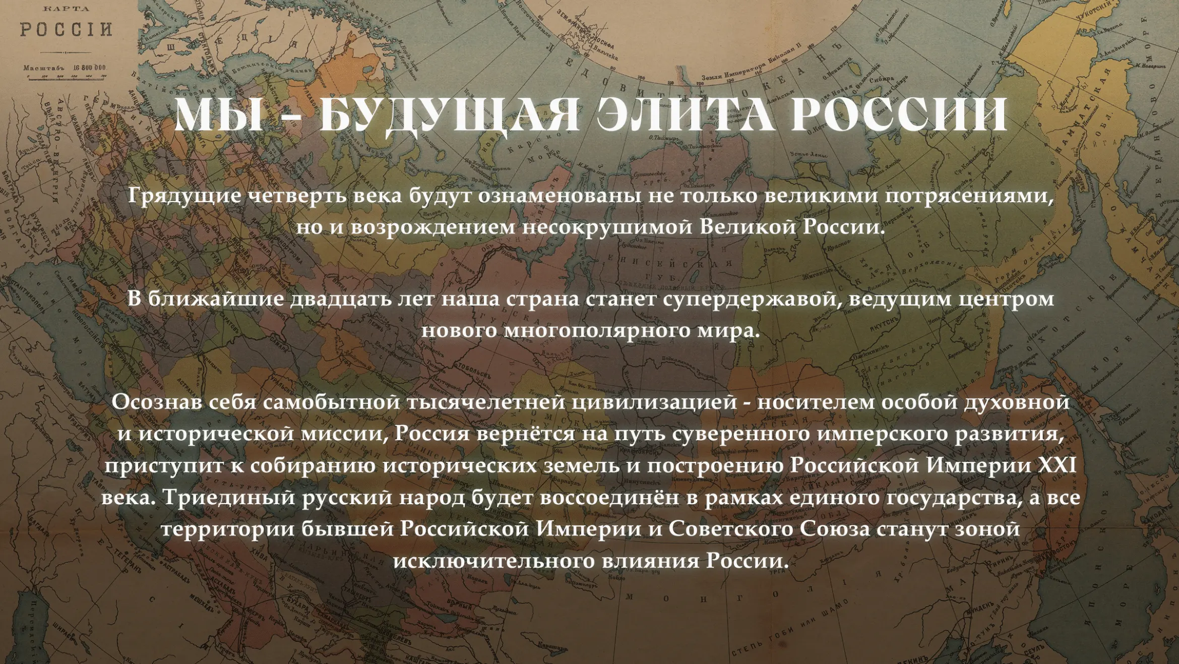 «Миссию России» члены братства обобщают до вселенской: Российская Федерация должна победить «глобальное зло», «стоять на страже Христианской Веры и традиционных ценностей», а Русская Православная Церковь должна «получить вселенский статус и стать первенствующей в мировом Православии».